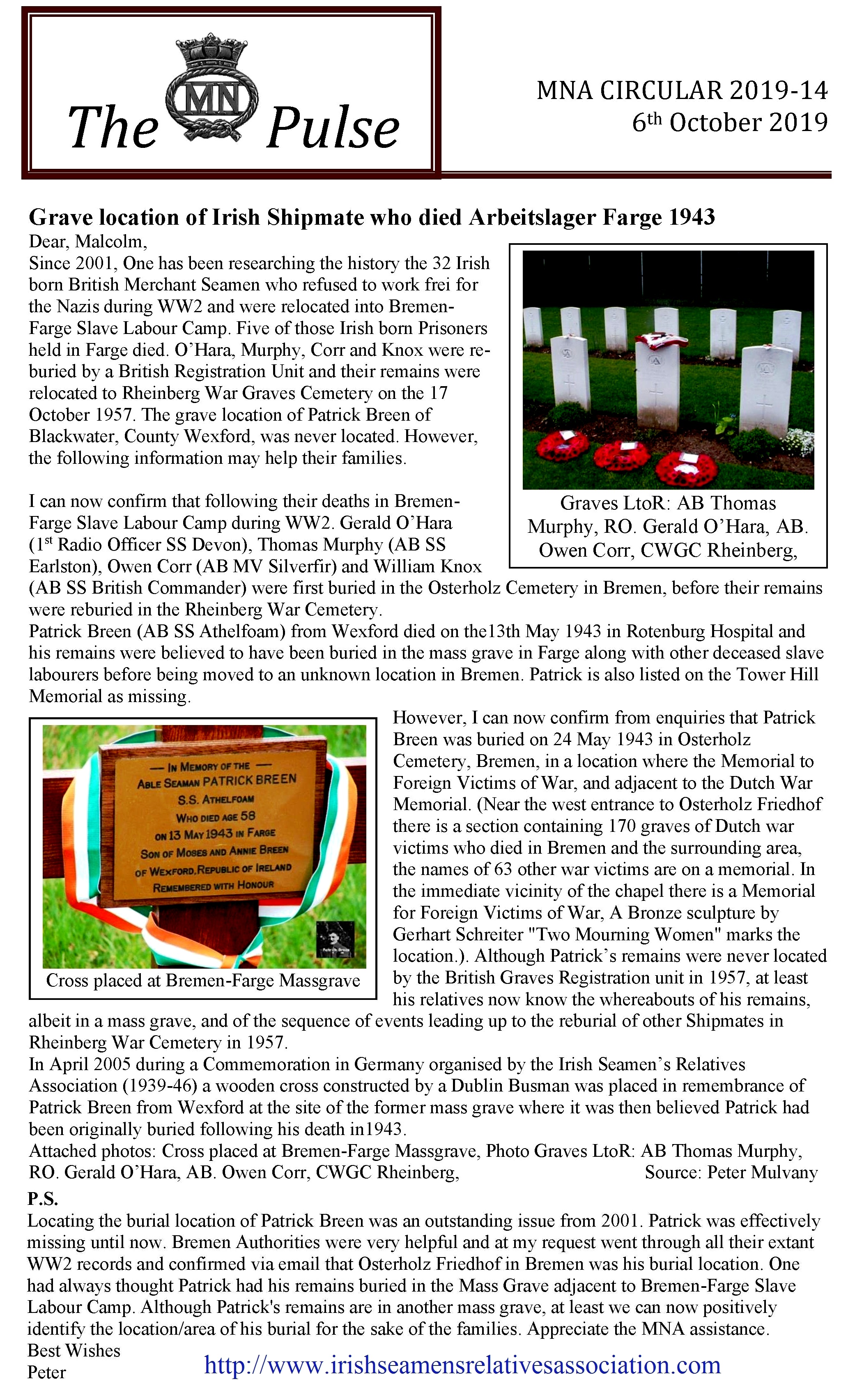 At Page 78 the author records: Re Patrick Breen deceased 13 May 1943: “It is not known what happened to his body but in all probability he was buried in one of the mass graves close to the camp”: To clarify: See article by Peter Mulvany published in the Merchant Navy Association Circular 06th October 2019 re the Grave location of Patrick Breen: